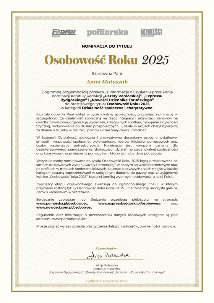 Szanowni Państwo! Z wielką dumą informujemy, że Anna Matuszak została nominowana do prestiżowego tytułu Osobowość Roku 2025 w kategorii „Działalność społeczna i charytatywna”.